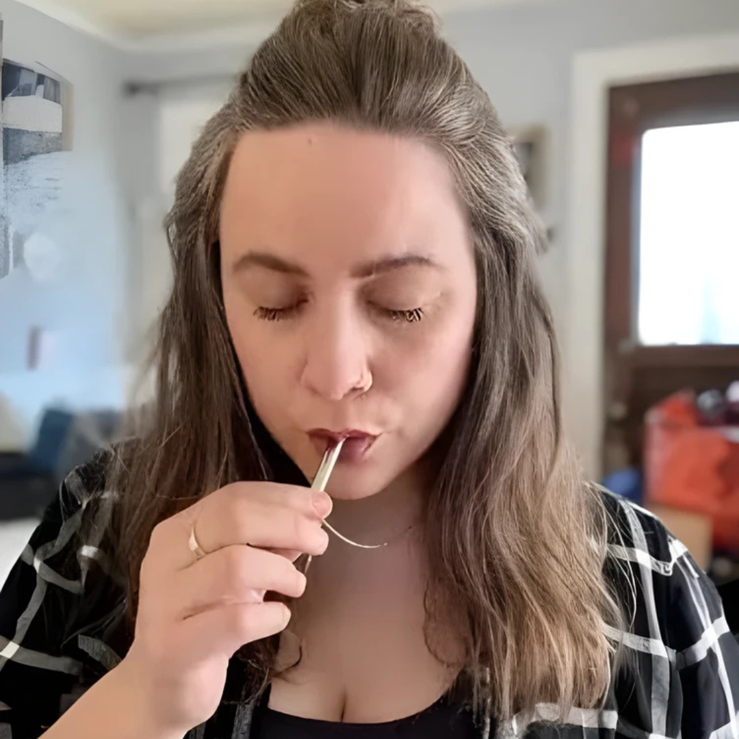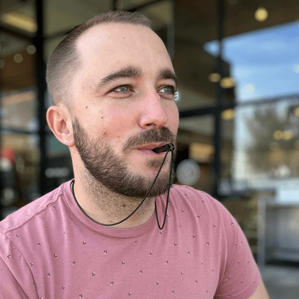 Coloca el collar en tus labios y suelta el aire lentamente a través de él. Está calibrado para que la exhalación dure 8–10 segundos, el tiempo ideal para que tu cuerpo se relaje.